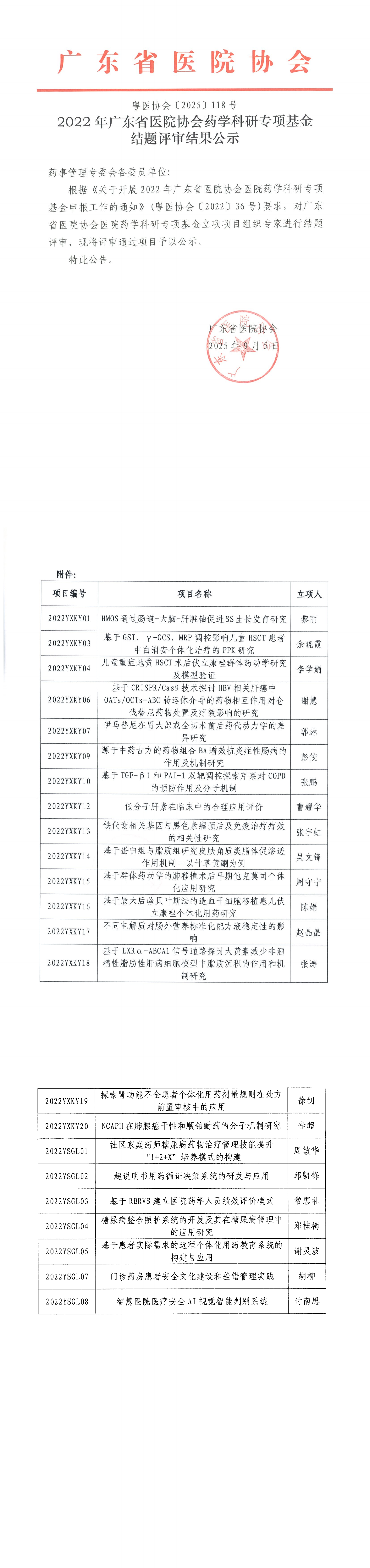 2022年广东省医院协会药学科研专项基金结题评审结果公示